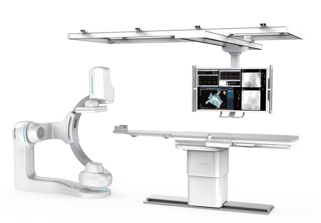 – Floor mounted C-arm, large range of movement along three concentric axes, affiliated with 2 meters longitudinal movement of cath-table enables head to toe examination/treatment without moving patient